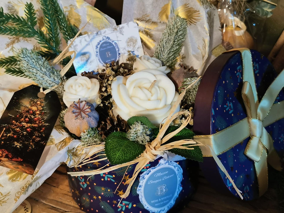 Des réalisations créées et décorées uniquement à la main, tout en cire végétale parfumée Sans parfum (sur demande).